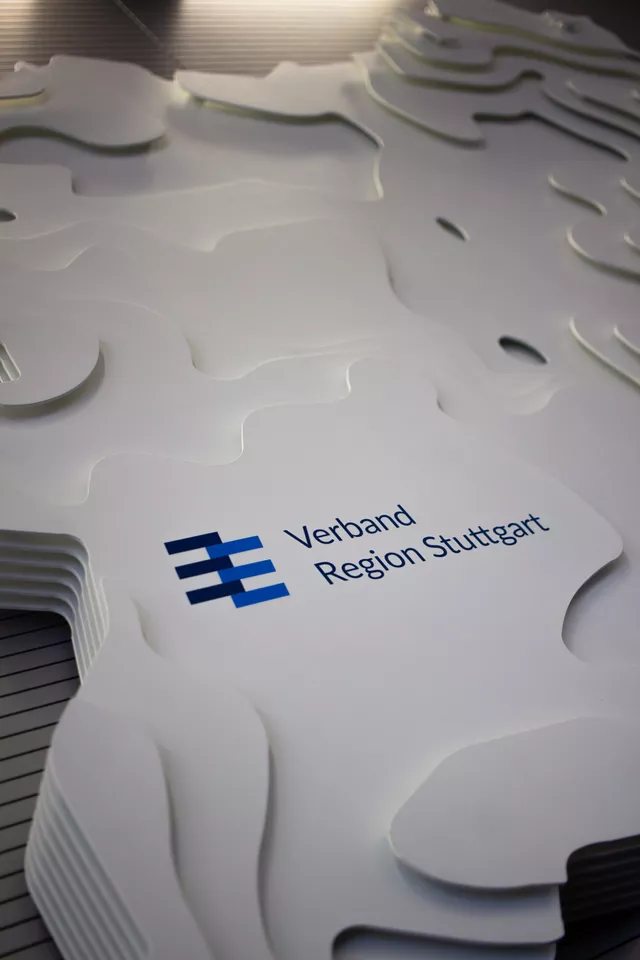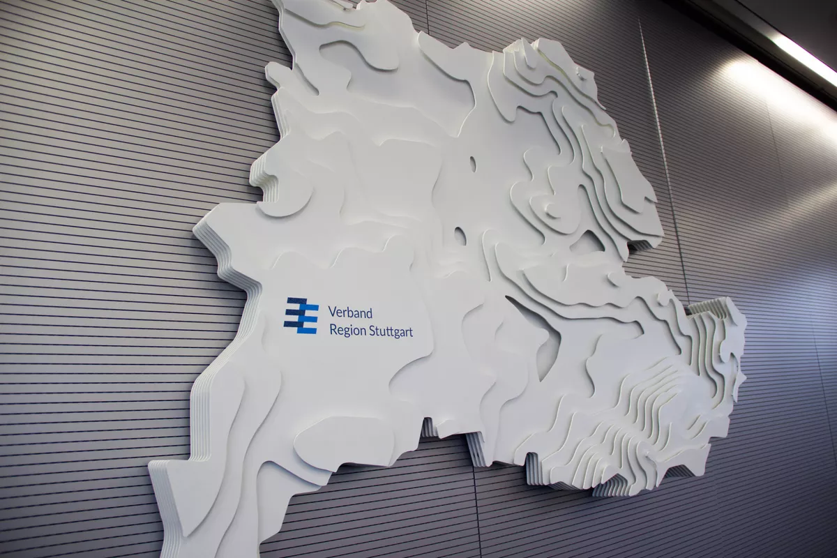 Unser maßgefertigtes Wandrelief kombiniert Design und Funktionalität auf höchstem Niveau. Dieses dreidimensionale Werbeschild für den Besprechungsraum des Verband Region Stuttgart wurde mit modernster CNC-Technik gefertigt und bringt die geografische Struktur der Region stilvoll zur Geltung.
