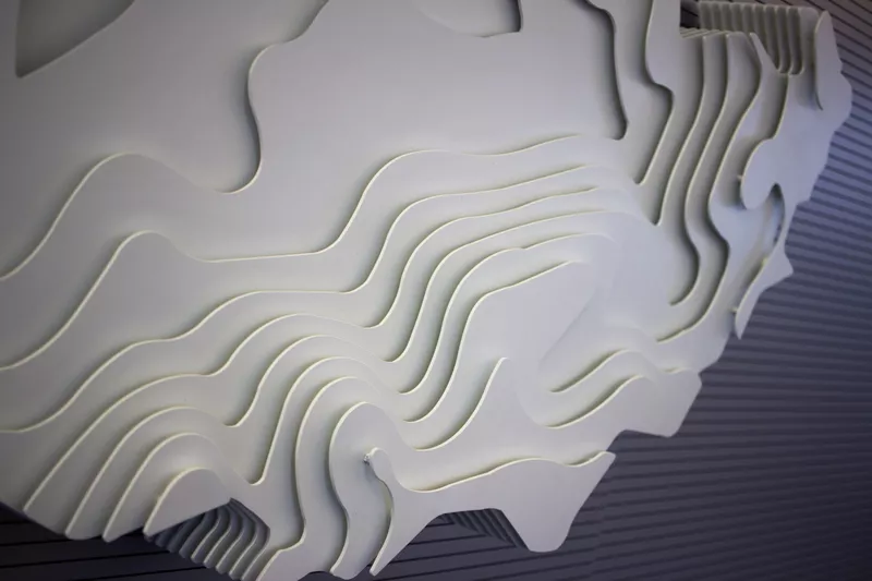 Die geschichteten Konturen verleihen dem Relief eine dynamische Tiefenwirkung, während die präzise Verarbeitung und das hochwertige Material für eine exklusive Optik sorgen. Perfekt für Unternehmen, die Wert auf eine professionelle und repräsentative Raumgestaltung legen.
