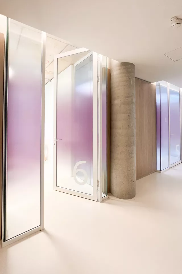 Sichtschutz aus transparenter Druckfolie, bedruckt mit farbigen Verläufen. Durch ein spezielles Druckverfahren läuft der Sichtschutz zur Decke und zum Boden transparent aus – die Architektur des Gebäudes bleibt dadurch sichtbar.