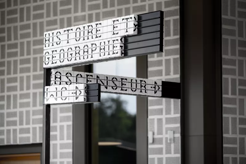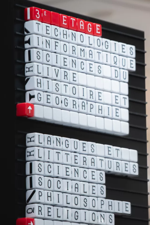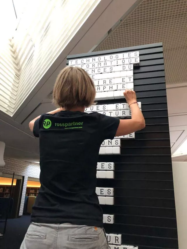 Ein herausragendes Merkmal unseres Projekts für die Nationalbibliothek Luxemburg ist das beeindruckende Leitsystem. Mit über 20.000 beschrifteten Würfeln und Platten haben wir ein maßgeschneidertes, visuell ansprechendes Leitsystem geschaffen. Diese einzigartige Anordnung ermöglicht nicht nur die klare Orientierung der Besucher, sondern auch die kreative Bildung von Wörtern, Zahlen und Symbolen.