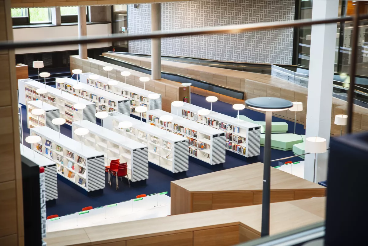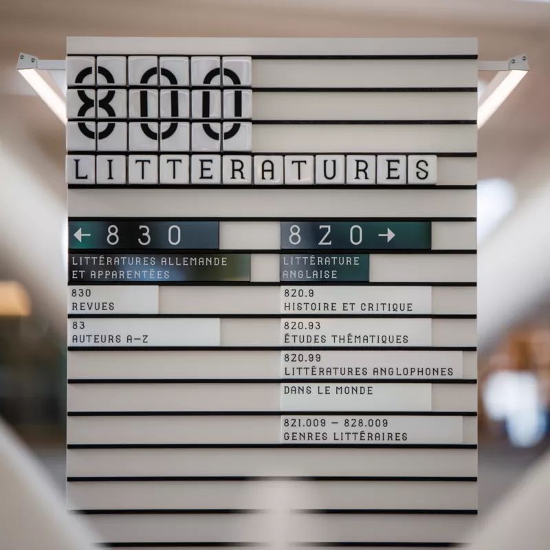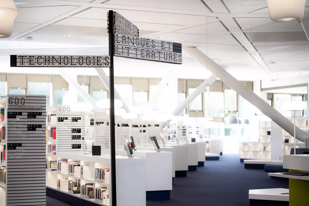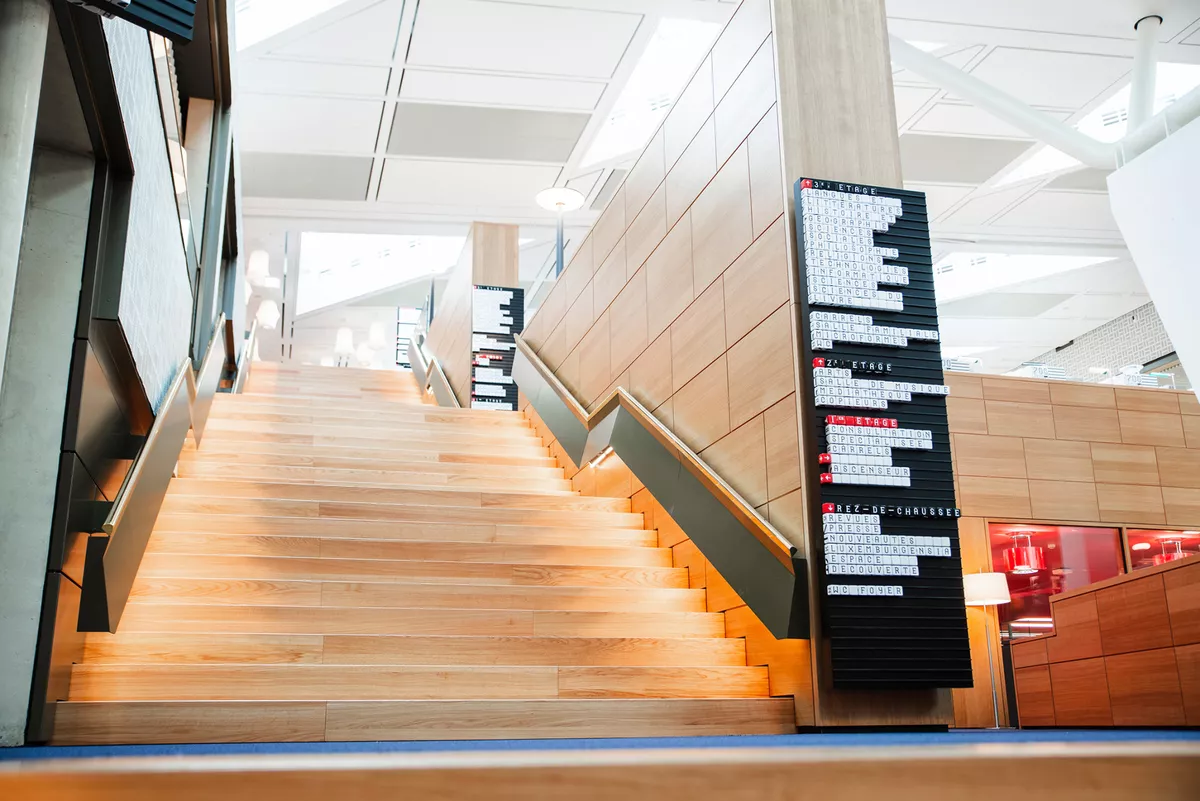 Die speziell angefertigten Halteplatten und Wegweiser fügen sich harmonisch in die Architektur ein und heben die Bibliothek als Ort der Innovation hervor. Durch die kreative Integration von Beschriftungen auf verschiedenen Ebenen wird das Leitsystem zu einem integralen Bestandteil des Bibliothekserlebnisses, das sowohl funktional als auch ästhetisch beeindruckt.