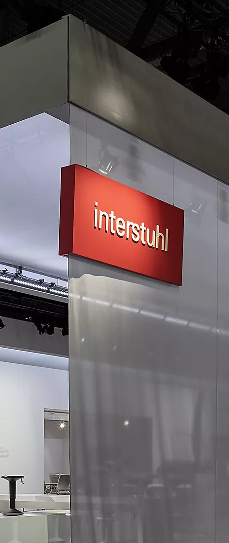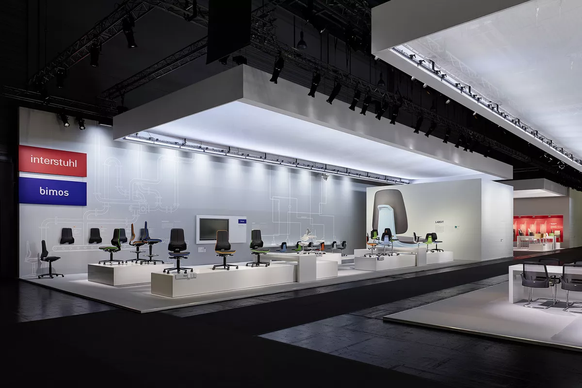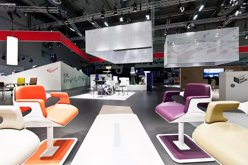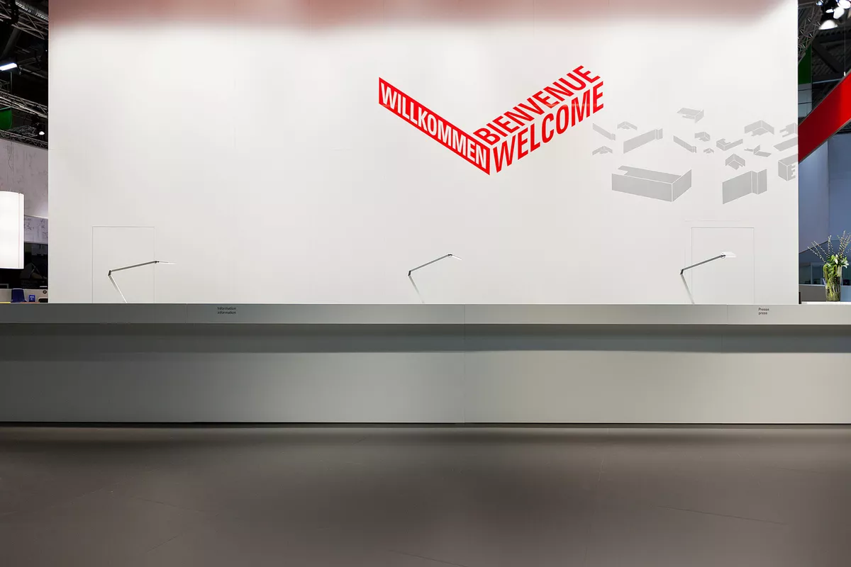 Mehrfarbige Wandfolien, freigestellte Digitadrucke im Großformat. Lackierte Holzverkleidungen mit gefrästen Logos die an den Messewänden angebracht sind, bzw. abgehängt von der Decke.