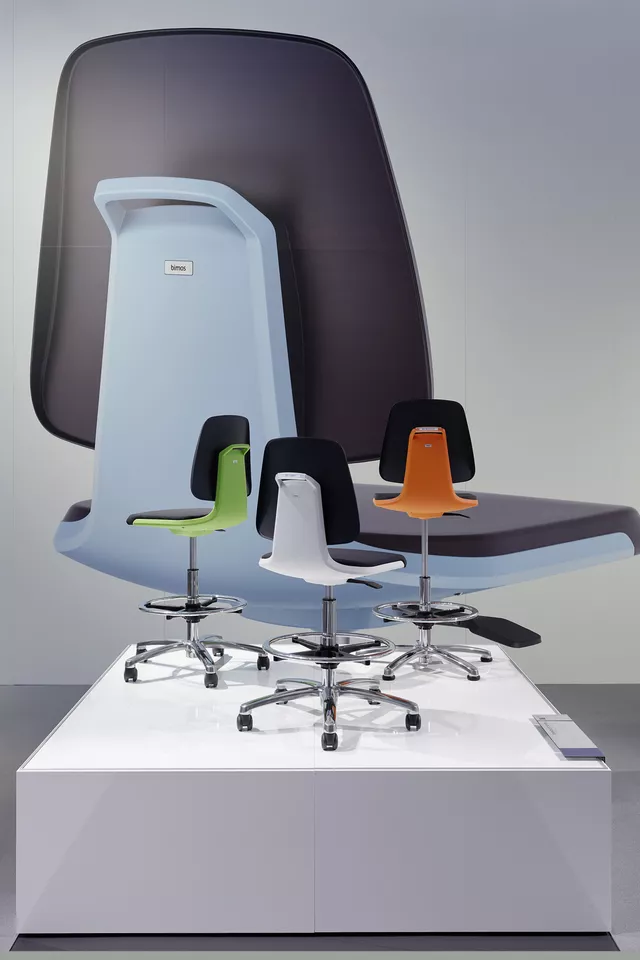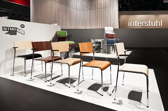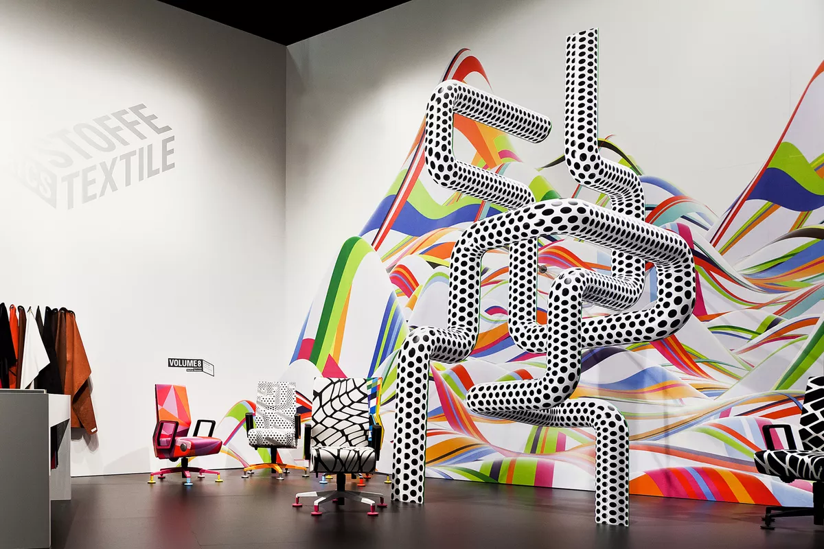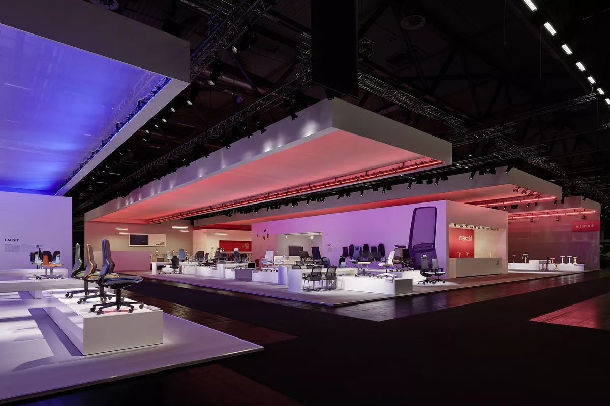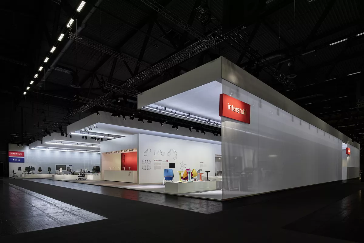 Mehrfarbige Wandfolien, freigestellte Digitadrucke im Großformat. Lackierte Holzverkleidungen mit gefrästen Logos die an den Messewänden angebracht sind, bzw. abgehängt von der Decke.