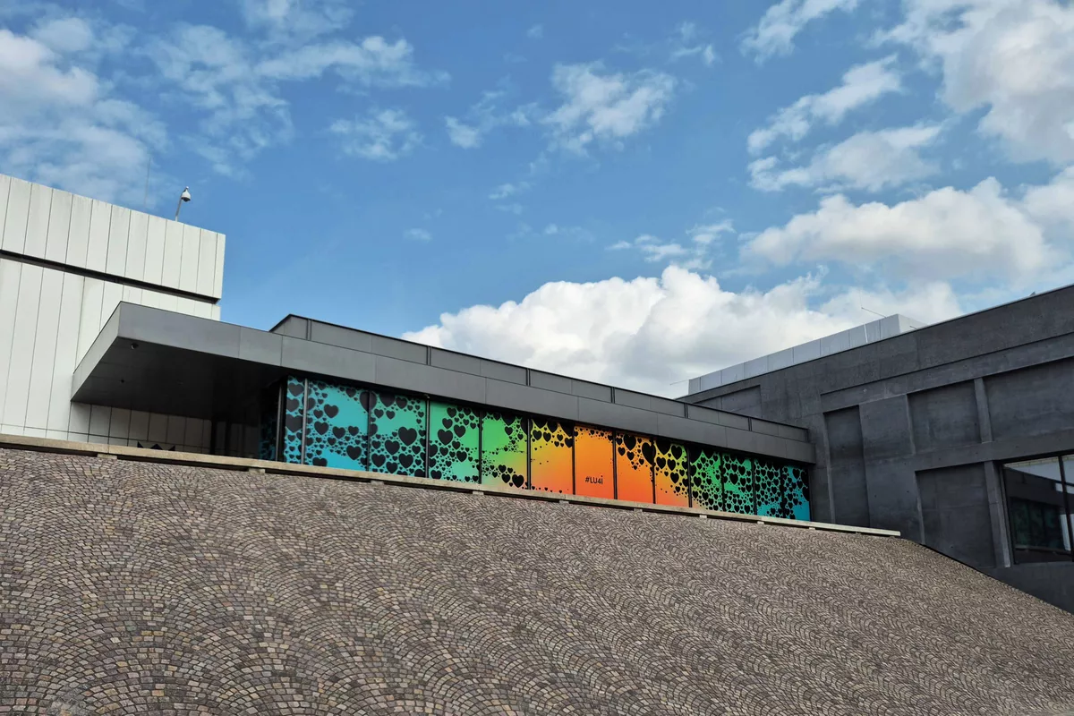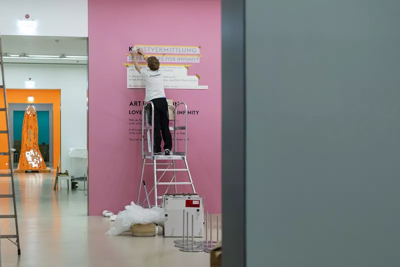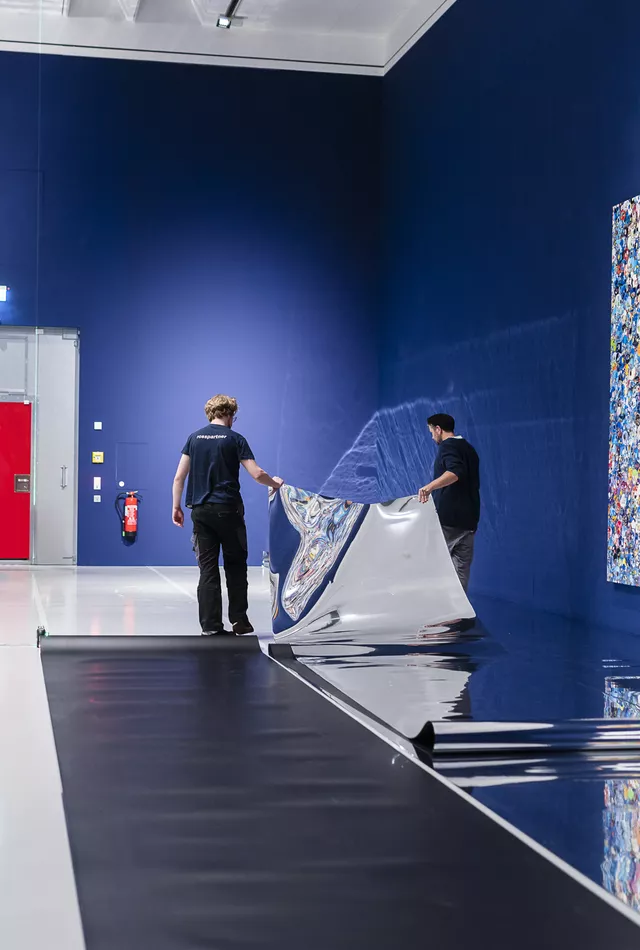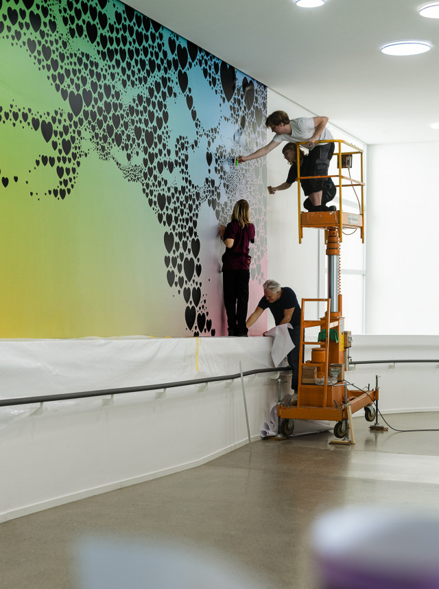 Für die Ausstellung love u 4 infinite im Sprengel Museum Hannover haben wir in Zusammenarbeit mit der Agentur Randgruppe Racing Team ein außergewöhnliches Raumkonzept umgesetzt. Zentrale Elemente sind eine 7 Meter hohe und 21,3 Meter lange Verlaufswand, die nahtlos in einen farblich abgestimmten Verlaufsboden übergeht, sowie eine Halle mit 20 Metern Spiegelboden, der in den Verlauf integriert ist und einen eindrucksvollen Gesamteindruck erzeugt.