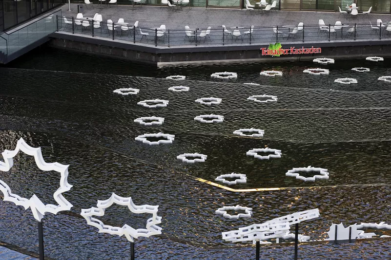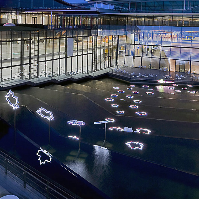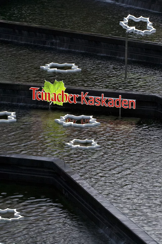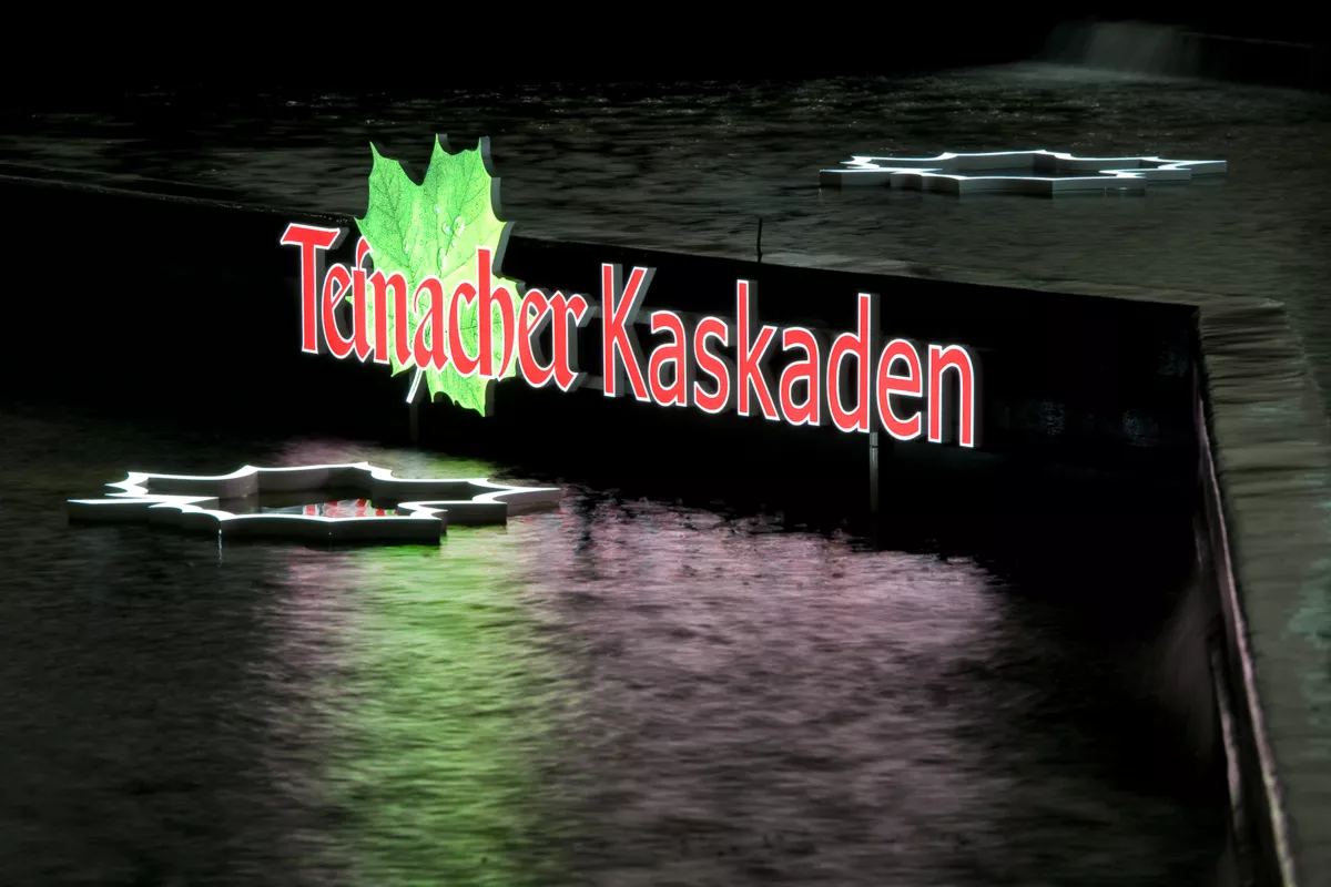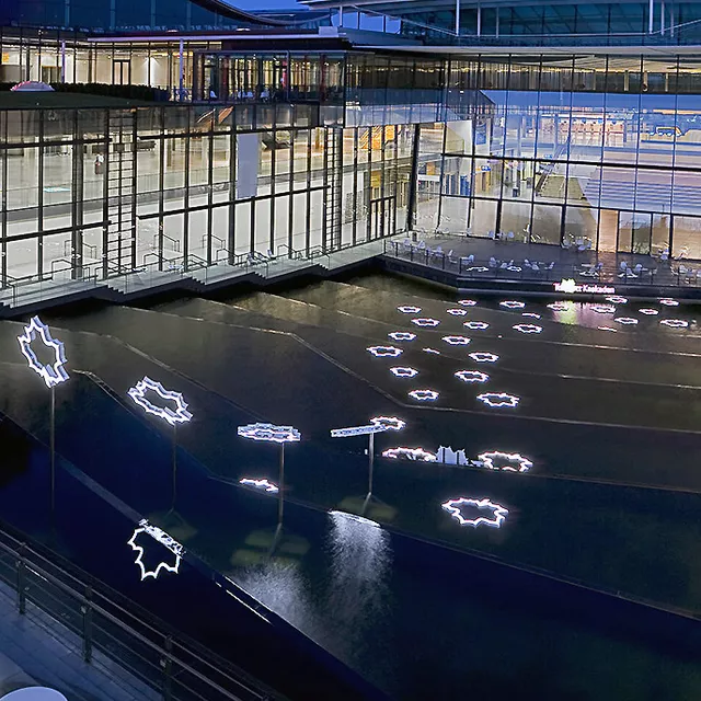 Schwimmende und stehende Lichtinstallation in den Wasserkaskaden der Landesmesse